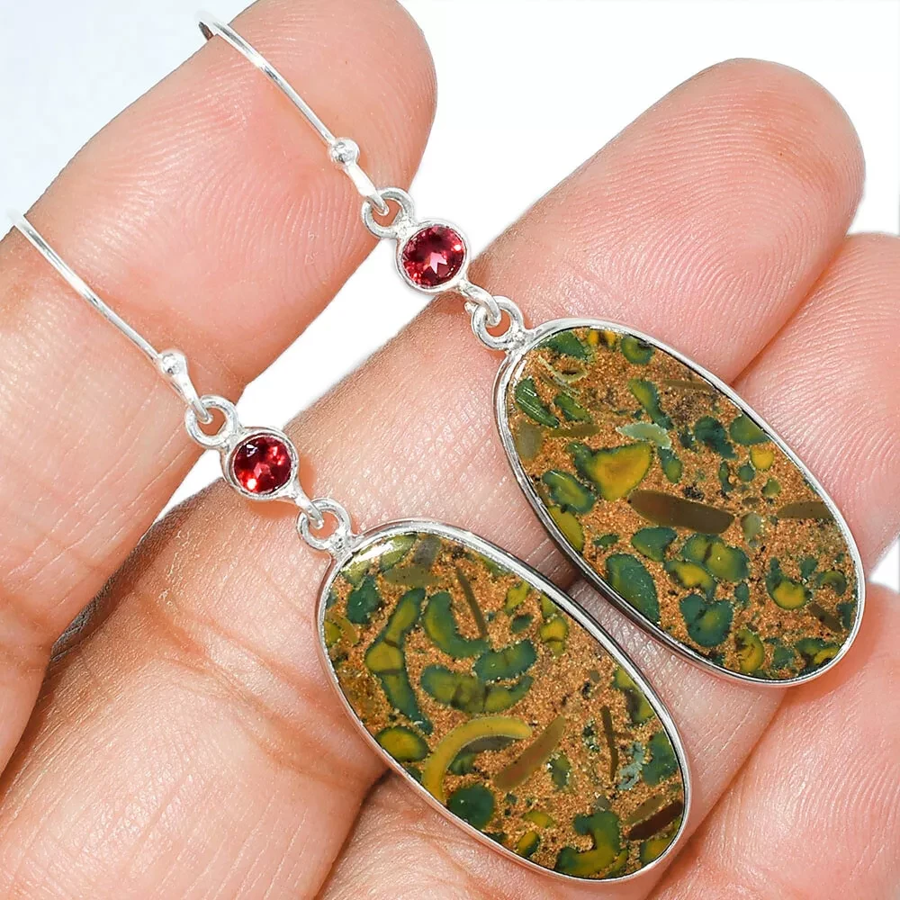 Срібні сережки з натуральною Фруктовою Яшмою, декор гранат.