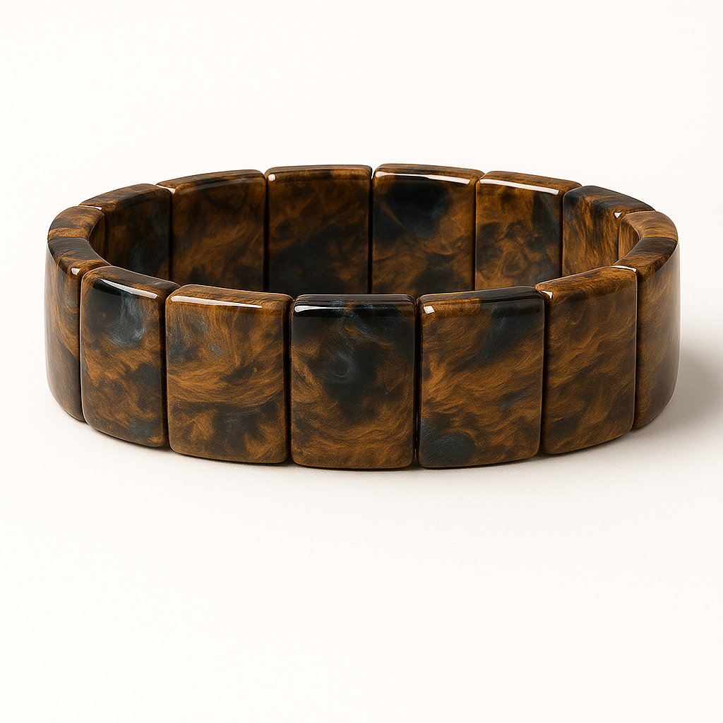 Браслет з пітерситу (петерситу) - це прикраса з рідкісного і загадкового каменю, відкритого в Намібії в середині XX століття. Його впізнають за характерними вихровими візерунками і глибокими відтінками синього, золотого, мідного і коричневого, що немов відобразили в собі бурхливе небо. Пітерсит - мінерал перетворення, що символізує внутрішні шторми, зміни і духовне пробудження.