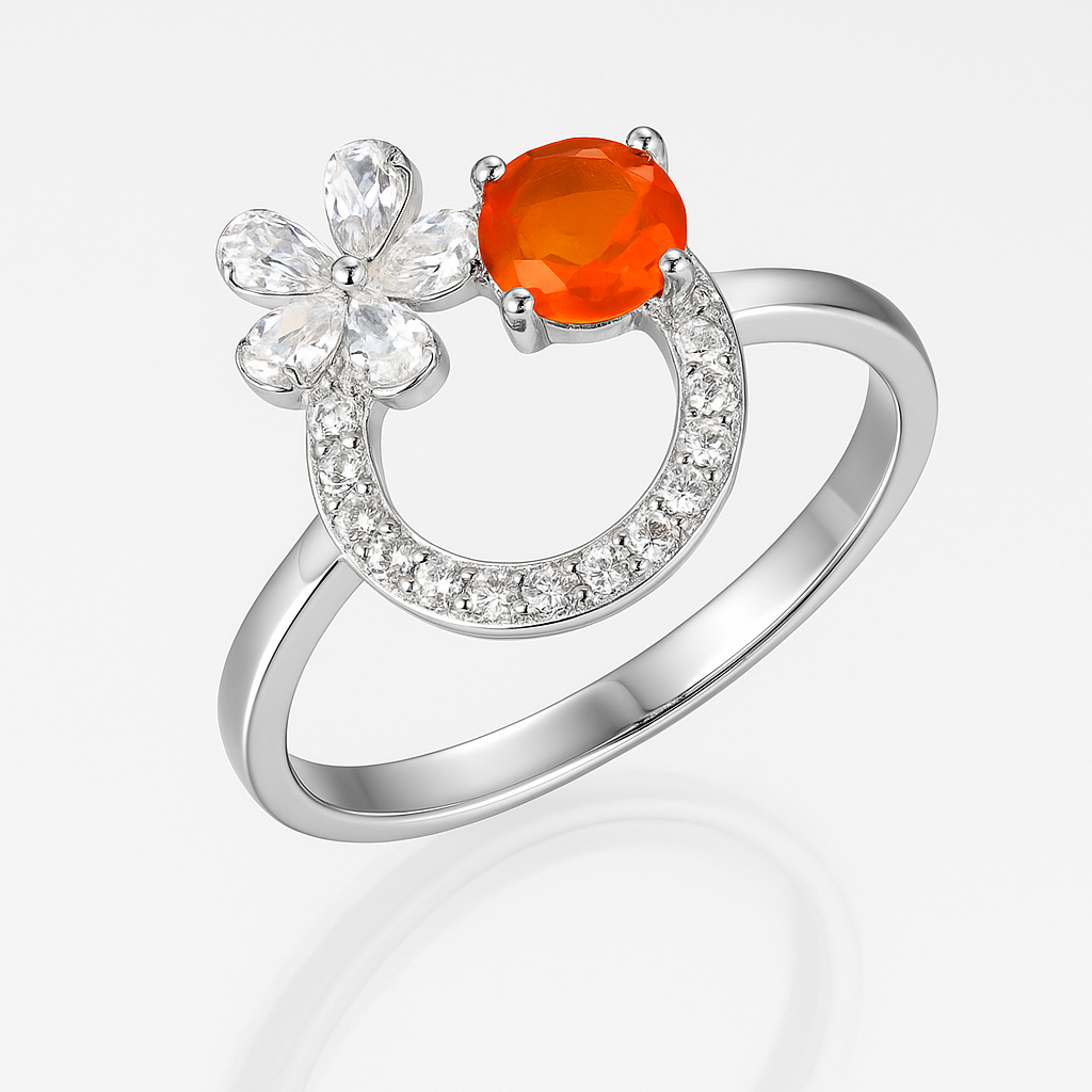 Цей камінь вирізняється яскравим внутрішнім світінням, яке немов переливається під будь-яким кутом світла. Він символізує енергію сонця, життєву силу і натхнення. В обрамленні срібла з покриттям білим золотом і сяючих цирконів опал розкриває свою красу ще яскравіше, створюючи образ квітки, народженої у вогні.
